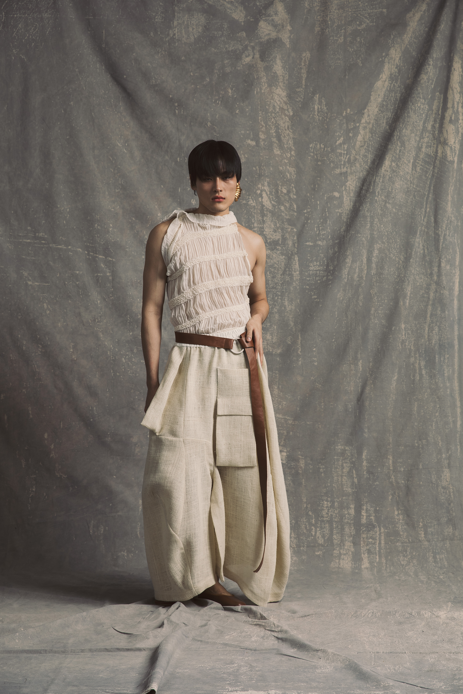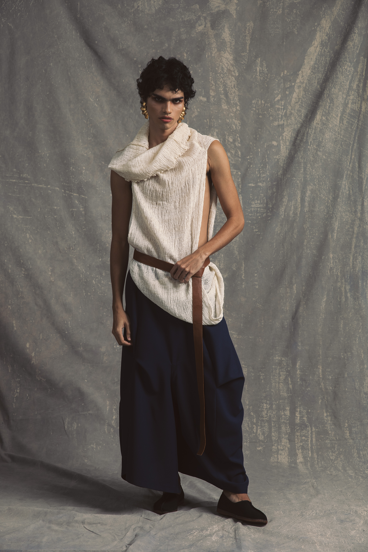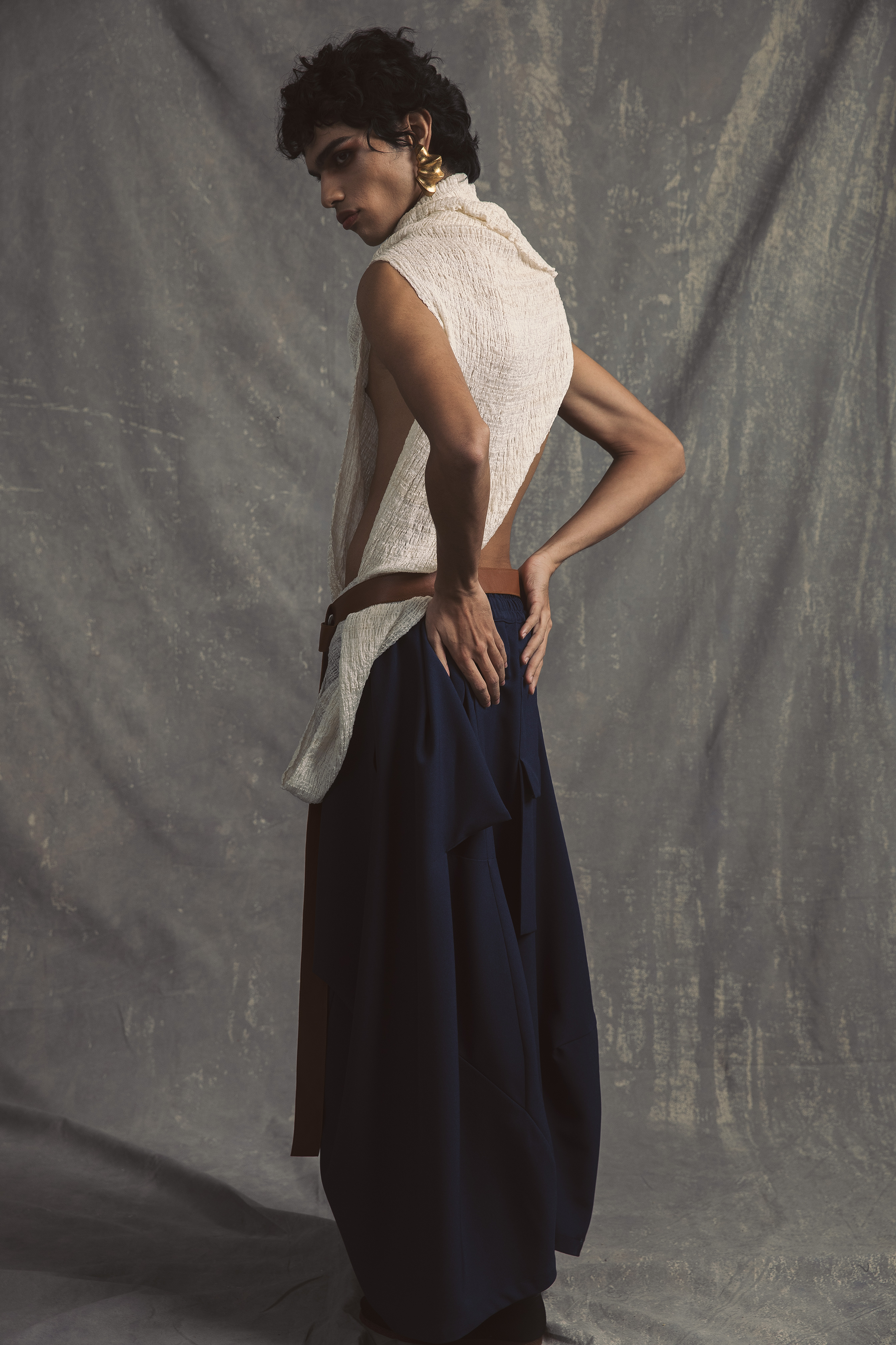 This collection represents a synthesis of Rajo’s journey so far, a culmination of his work and his deep-rooted aesthetic. Every garment serves as an exhibition of the styles and silhouettes that have shaped his design philosophy. Rooted in nostalgia, there is a distinct homage to the late 80’s New Romantics—a period where fashion, music, and individuality merged into a powerful movement. The collection also reflects his formative years in Japan, where a minimalist yet profound Japanese aesthetic left an indelible mark on his creative soul.