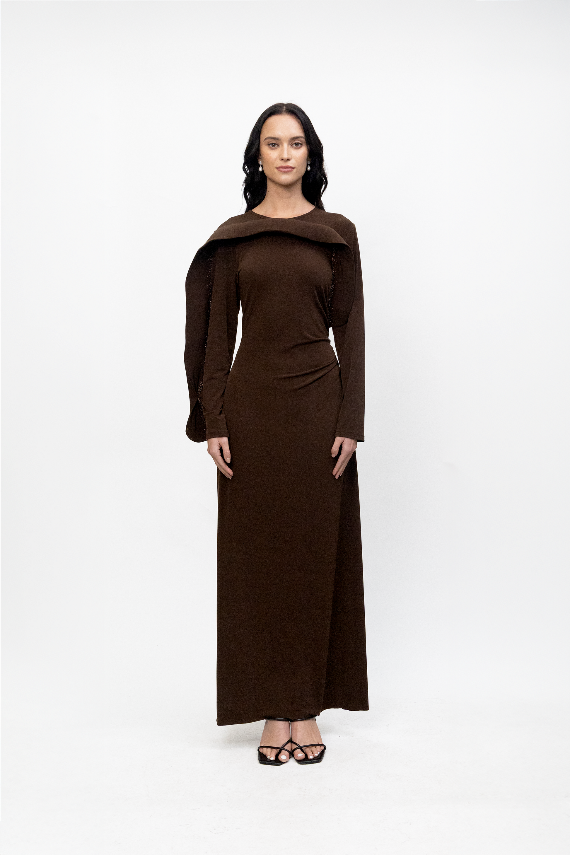 The CBK Gown is a body-hugging gown with arm panel featuring beadwork.