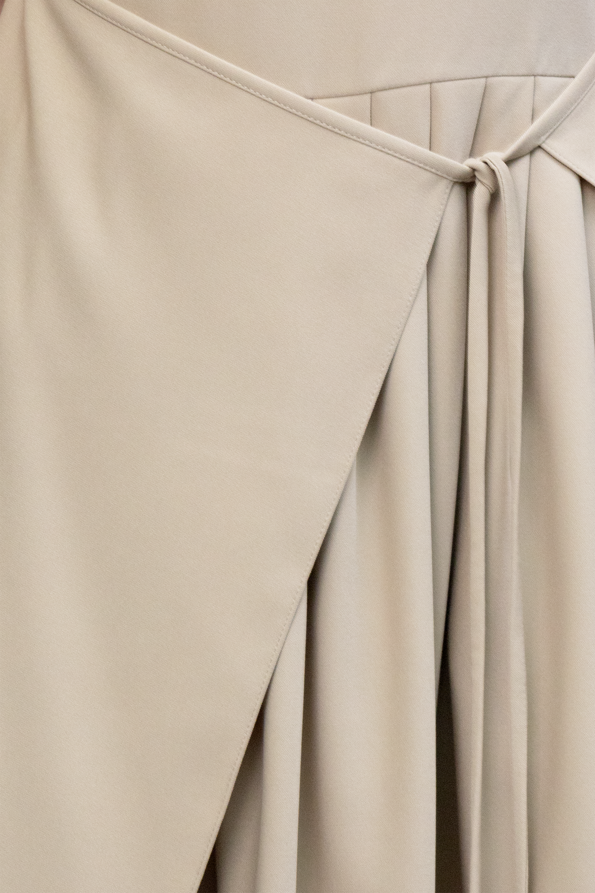 The Chrysler Dress is a sleeveless dress with asymmetrical neckline and flat-pleat skirt with fabric overlay.