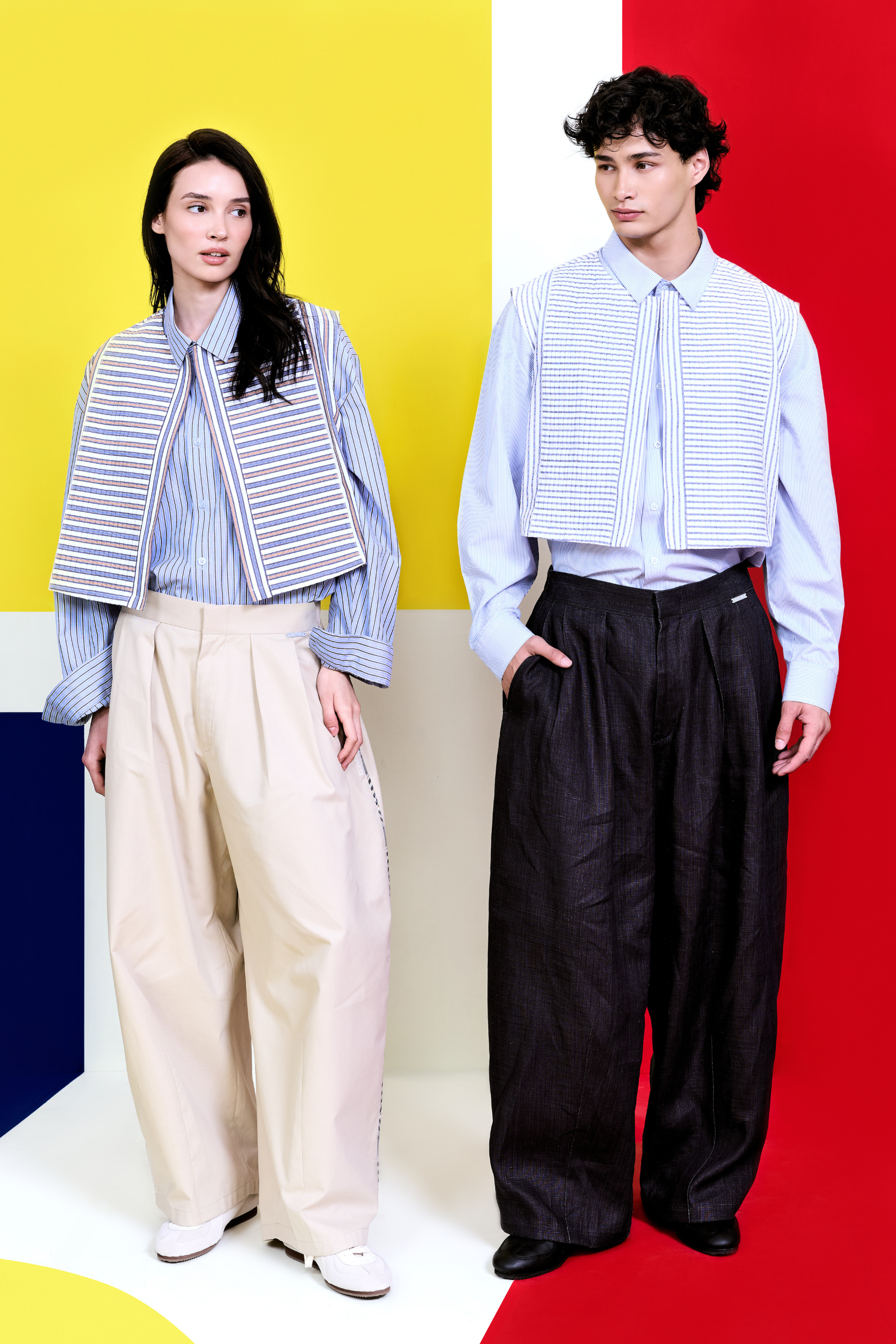 The Donnie Pants are barrel-leg trousers featuring front pleats and an elasticized back waistband.