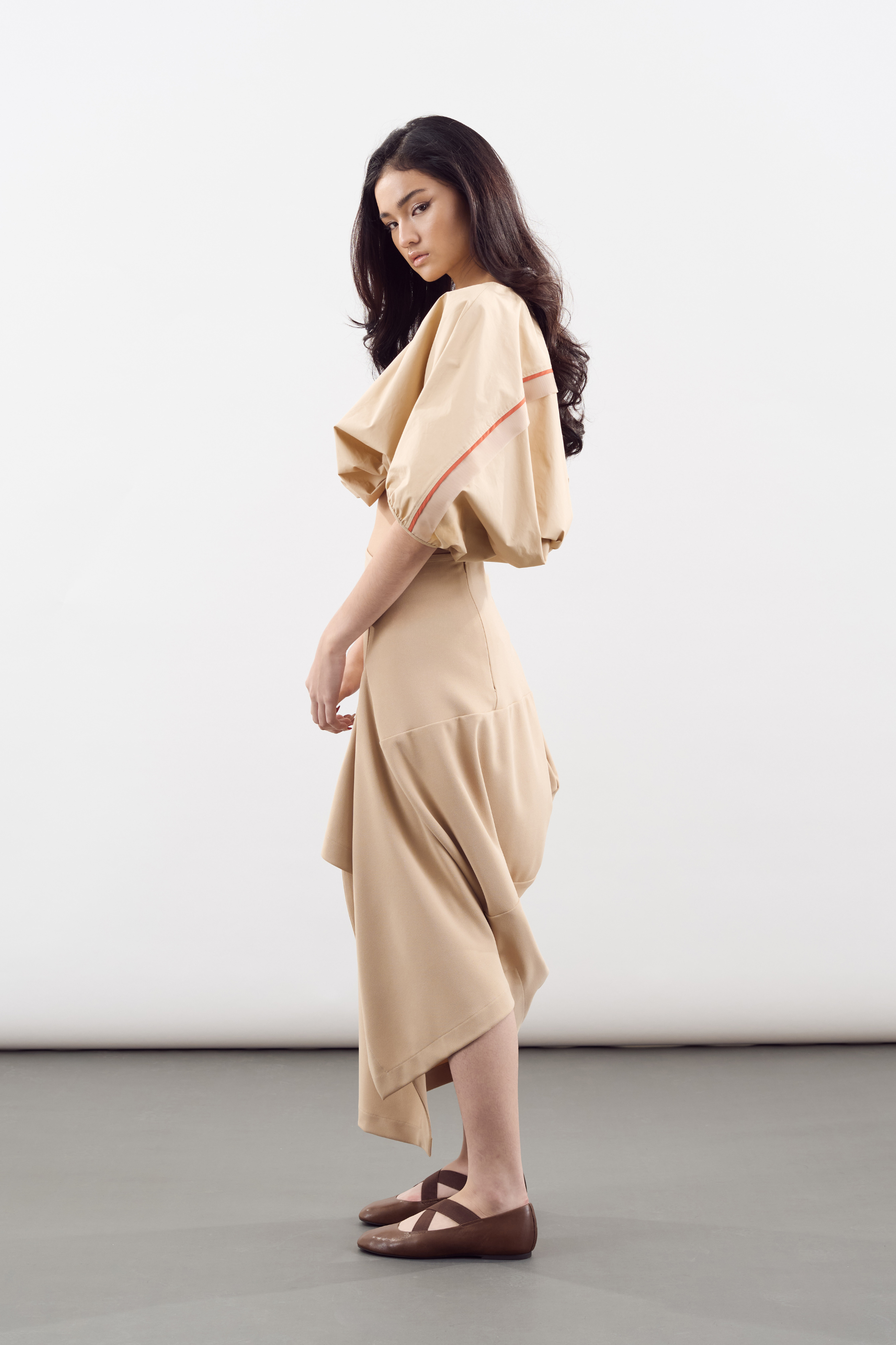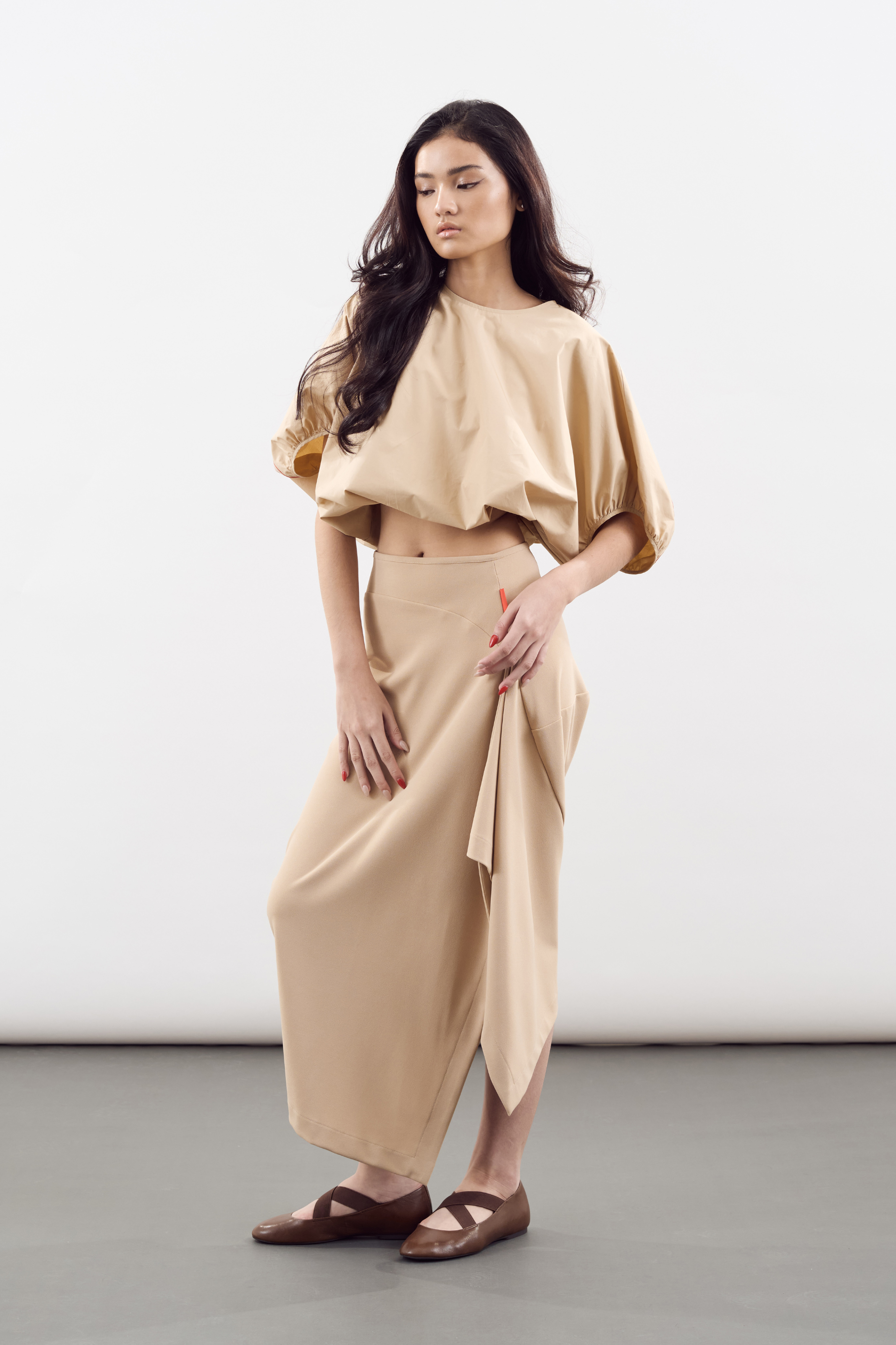 The Egg Top is a round neck circular top with horizontal piping details and gartered hemline.