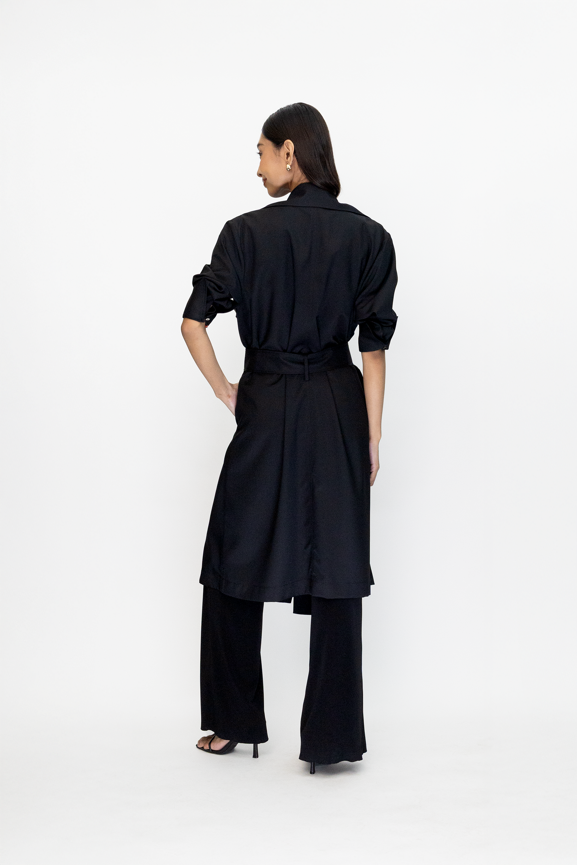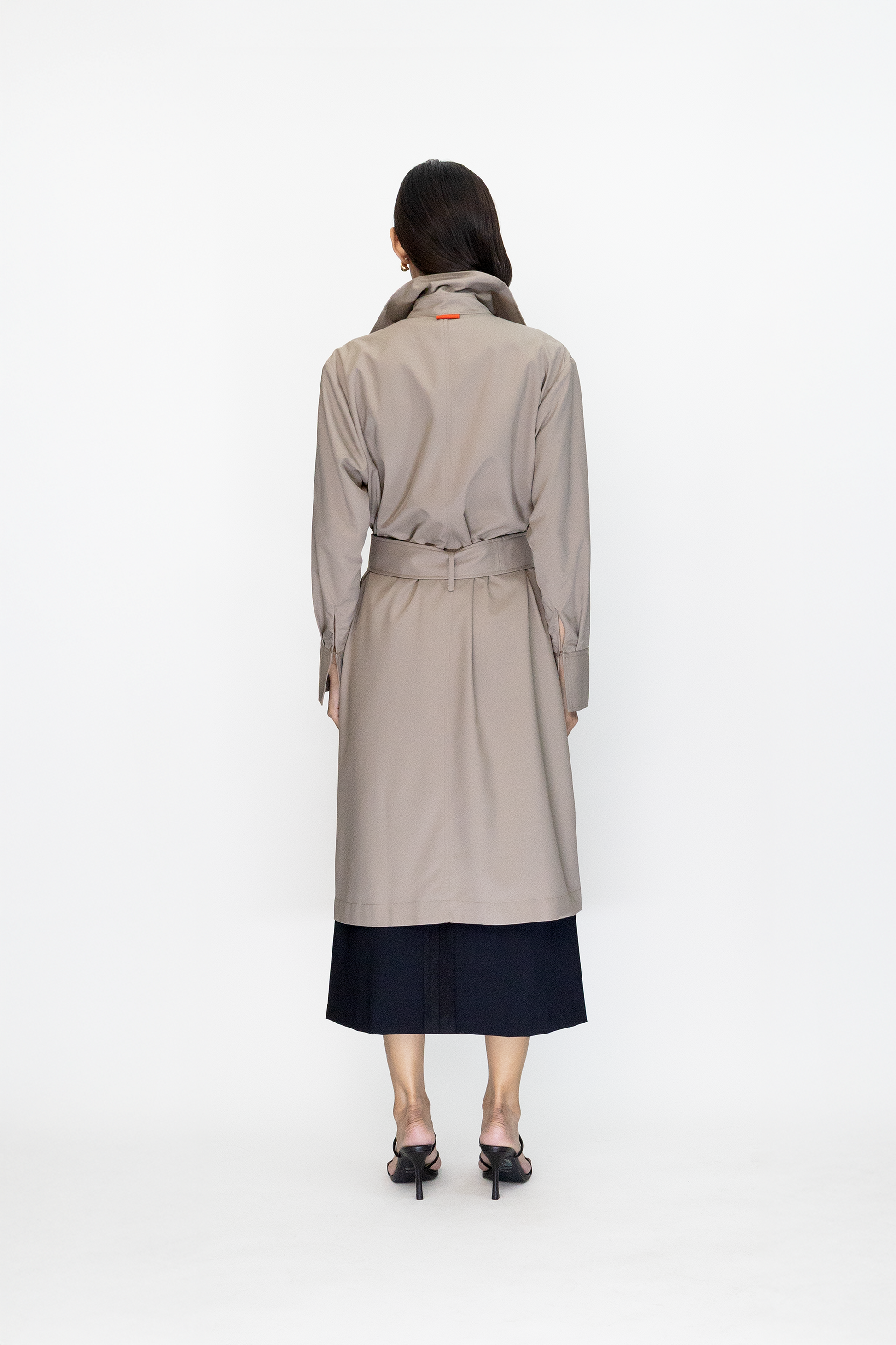 The Hermana Trench Coat is a classic cut trench with burnt orange contrast stitching.