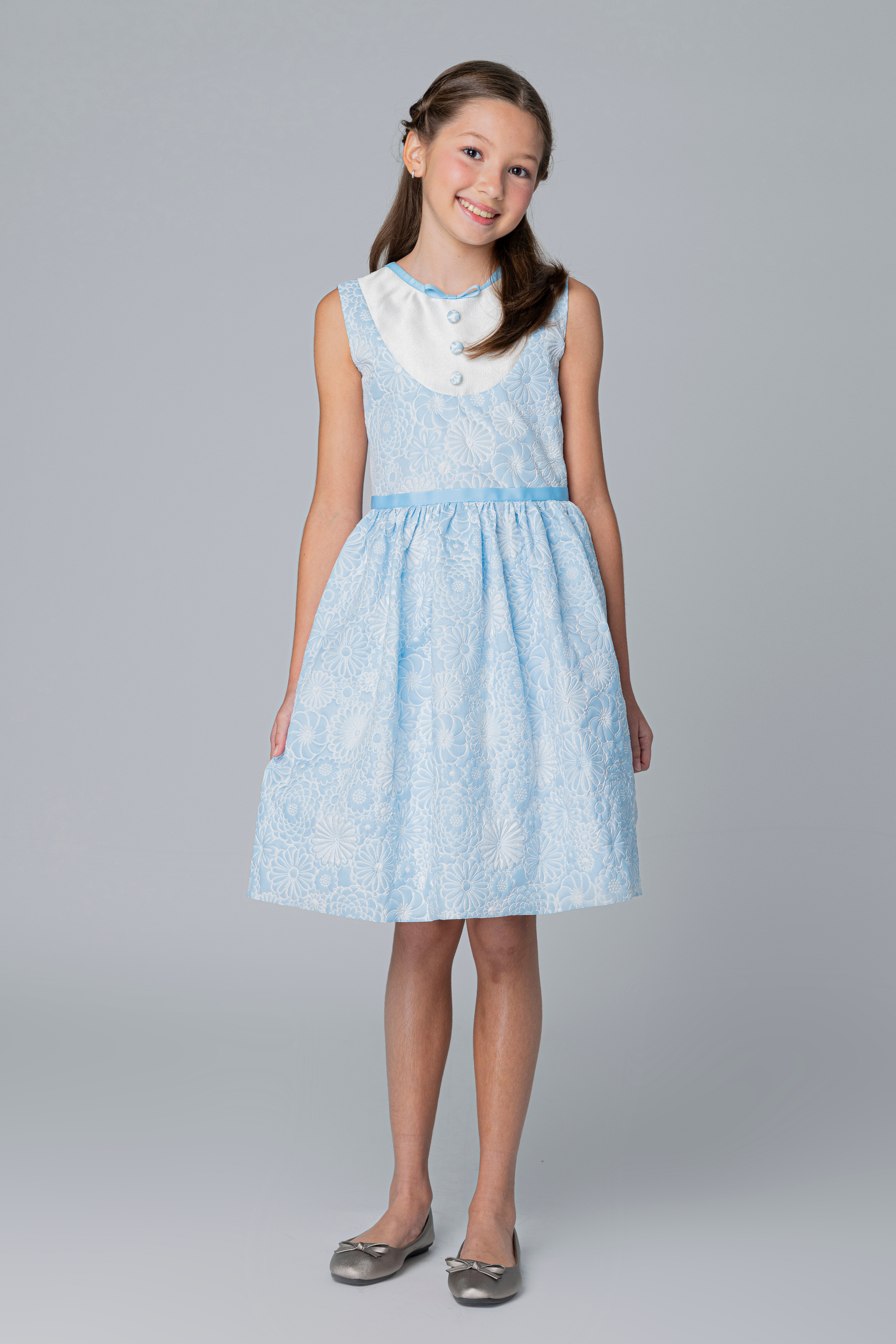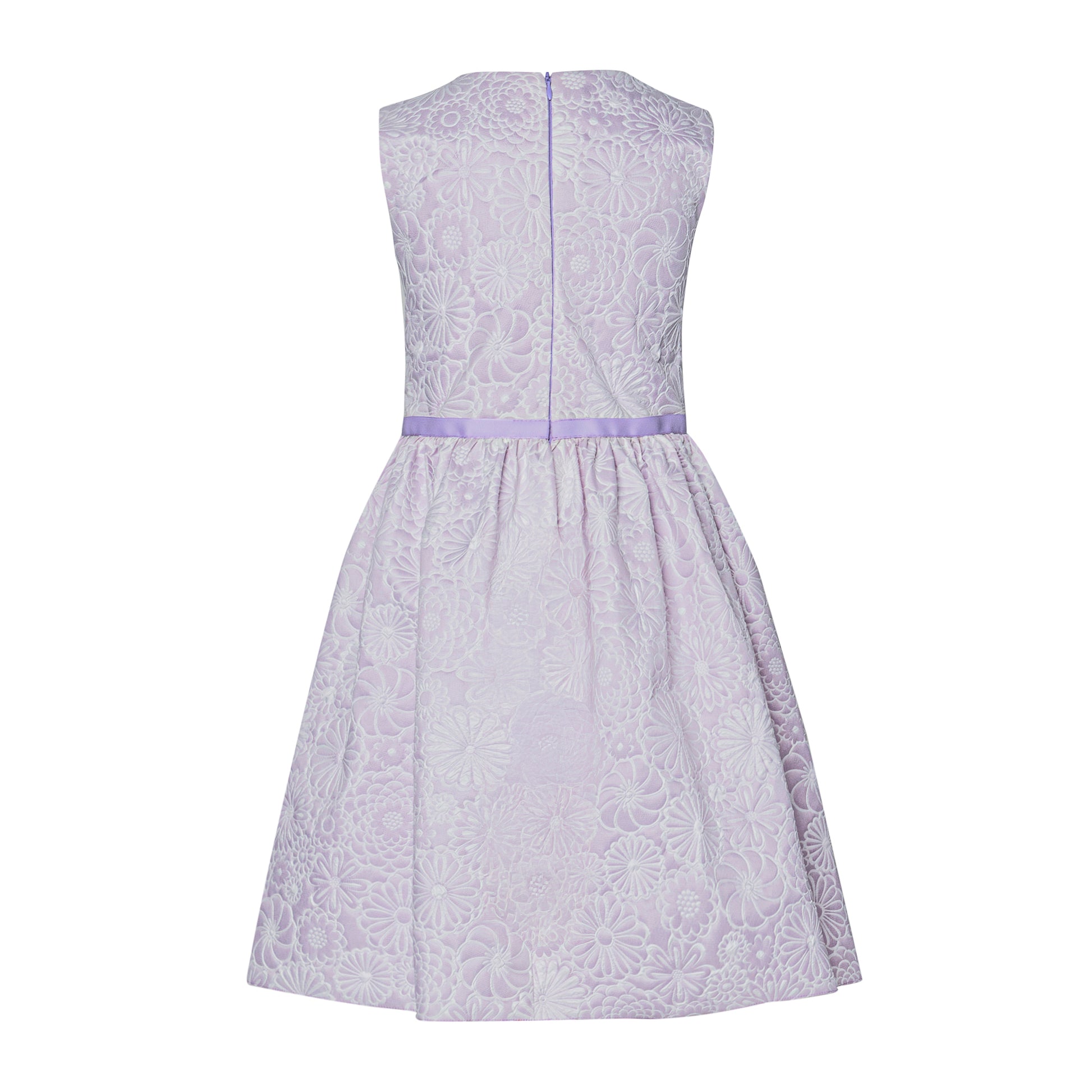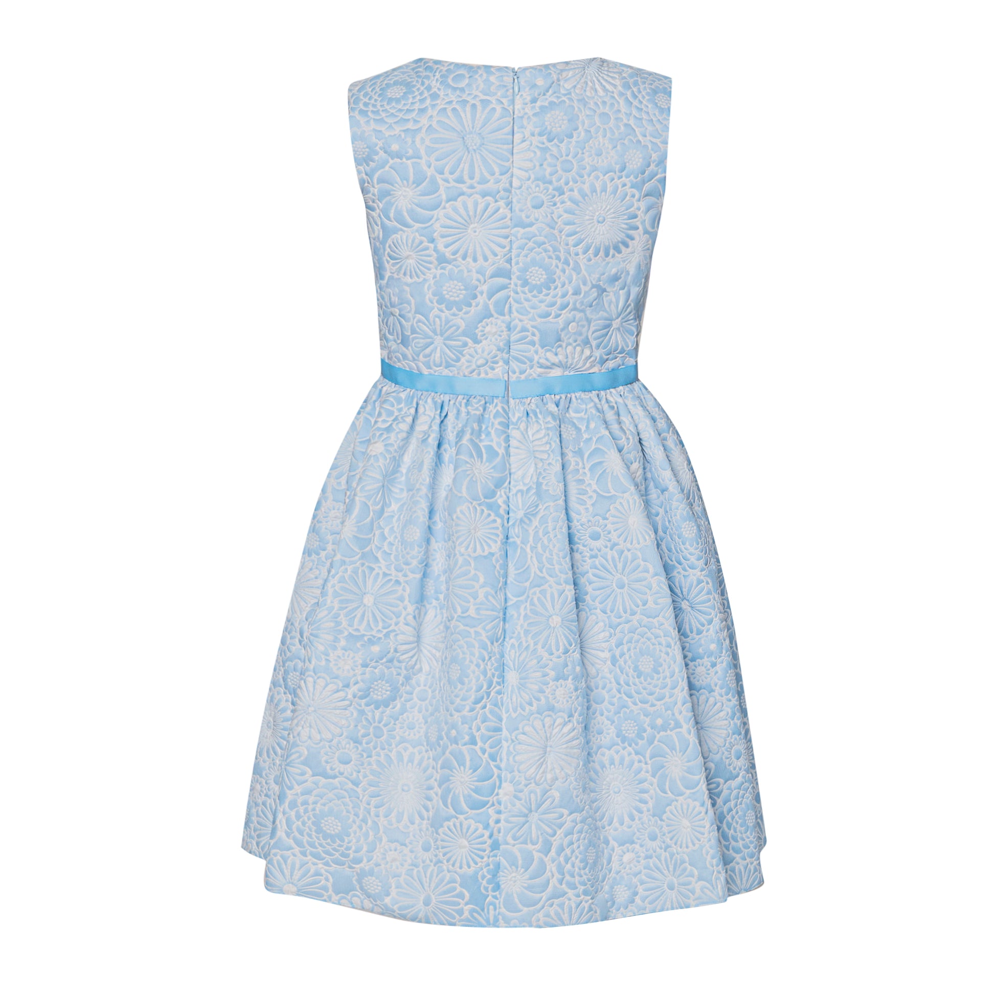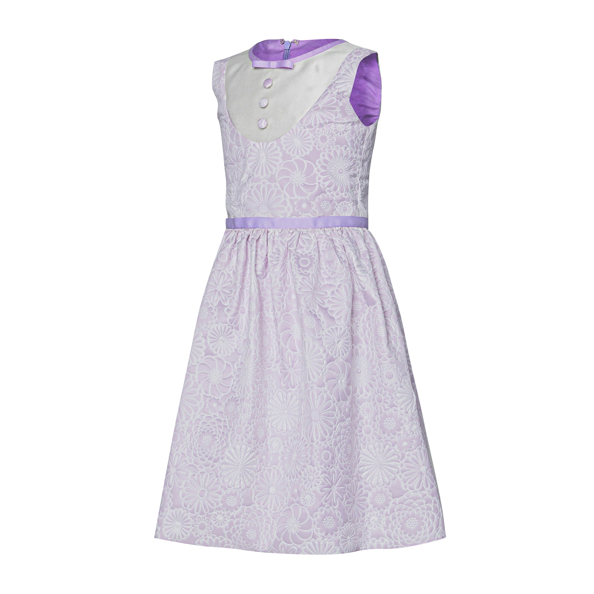 Sleeveless round neck dress with full skirt and bow details.