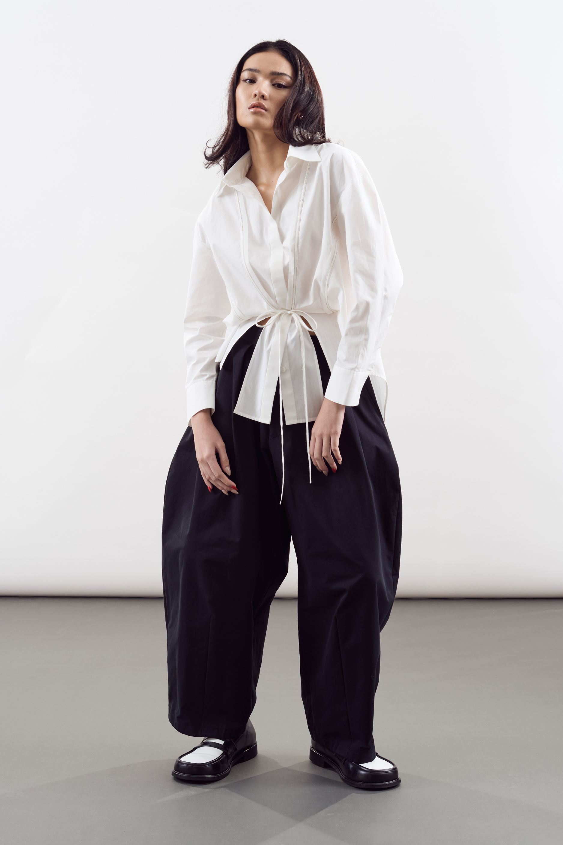 The Kareshi Top is a button-down shirt with piping and to-tie details.