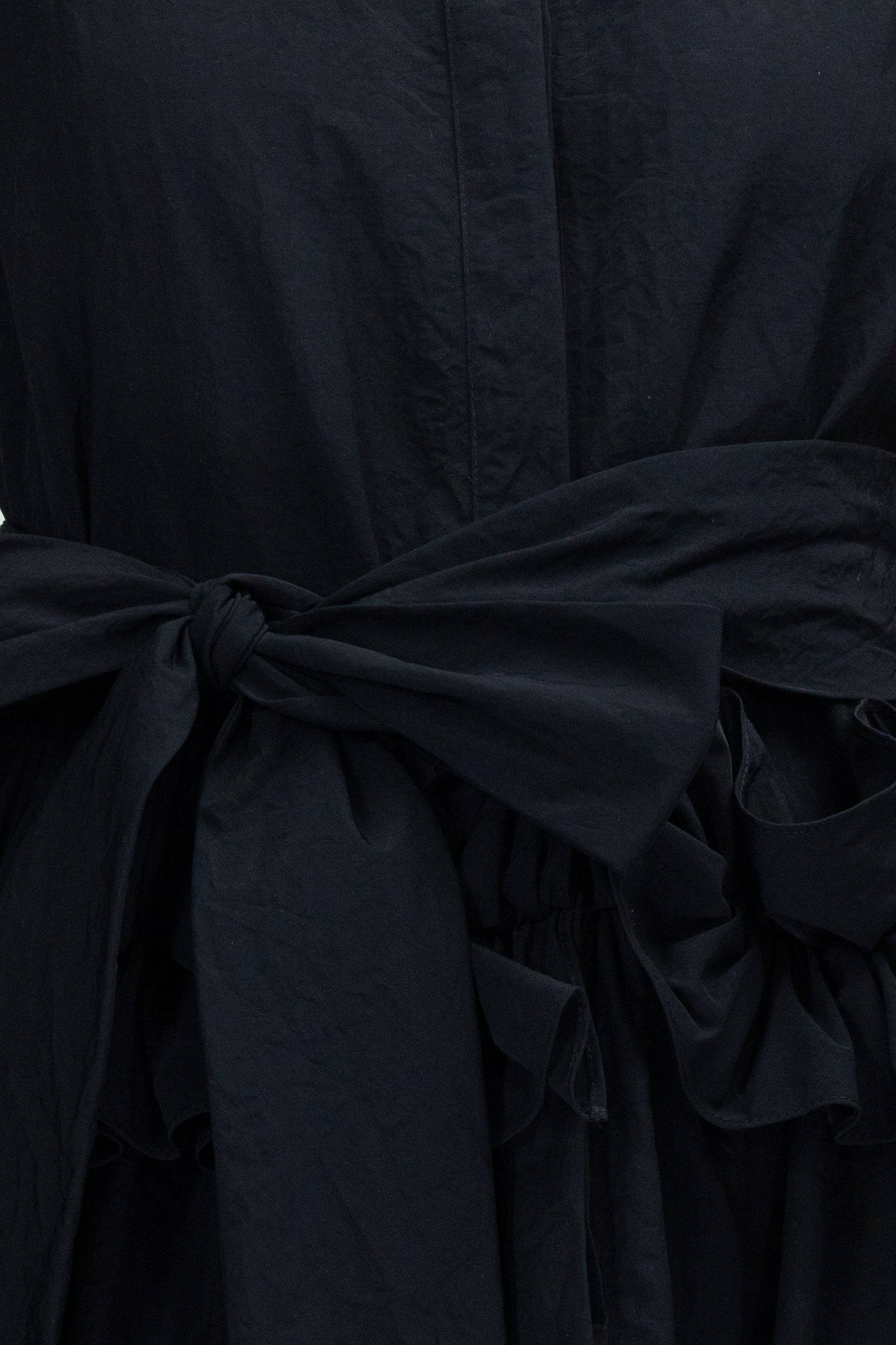 The Neosso Dress is a button-down sleeveless dress with peplum details and bow.