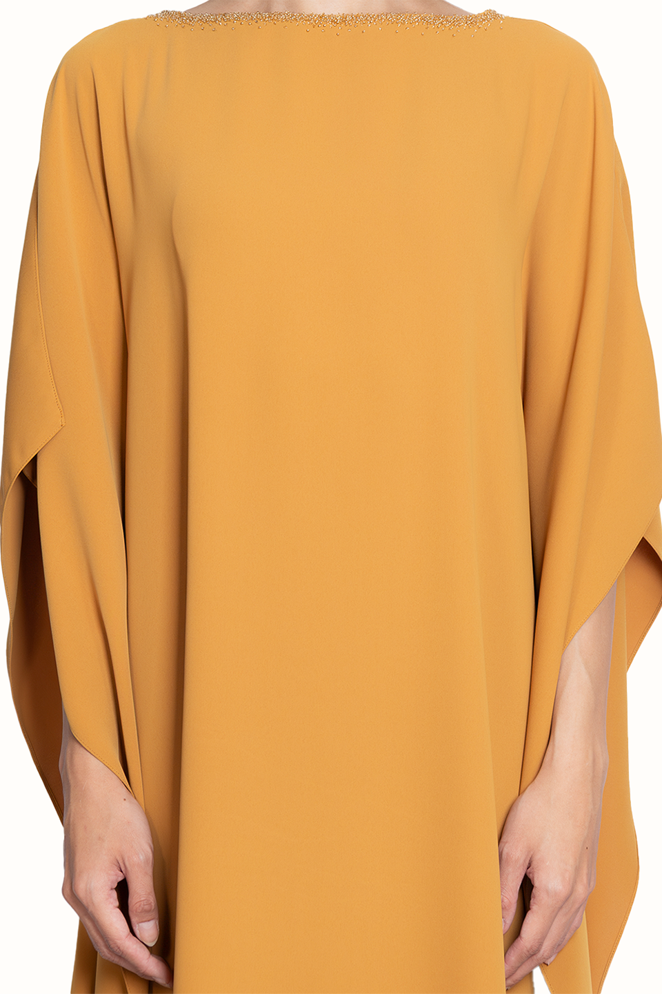 The Rafaela Gown is a kaftan-style silhouette with a embellished semi-boat neckline.