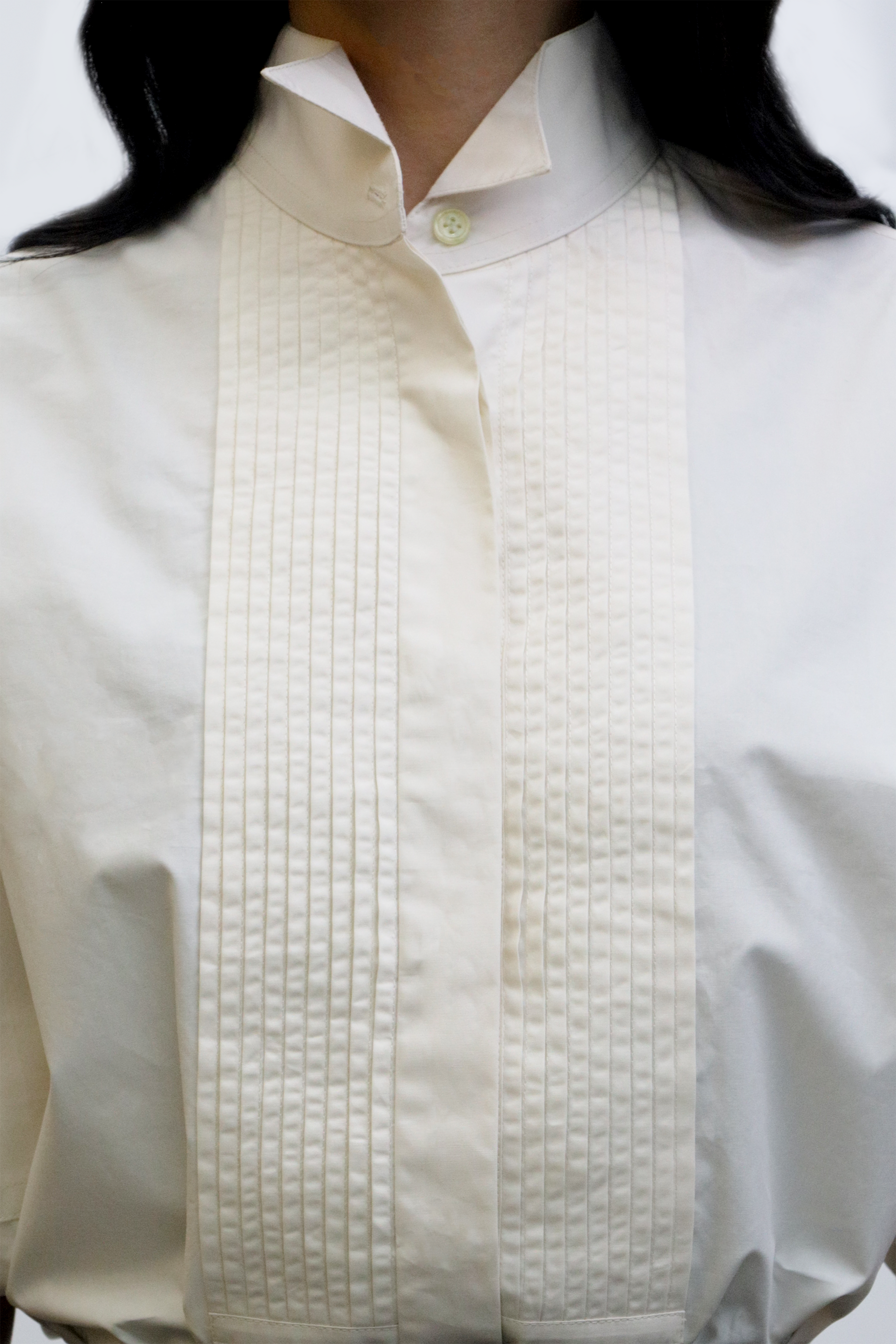 The Sola Top is a button down shirt with pleated front bib and extended cuff.