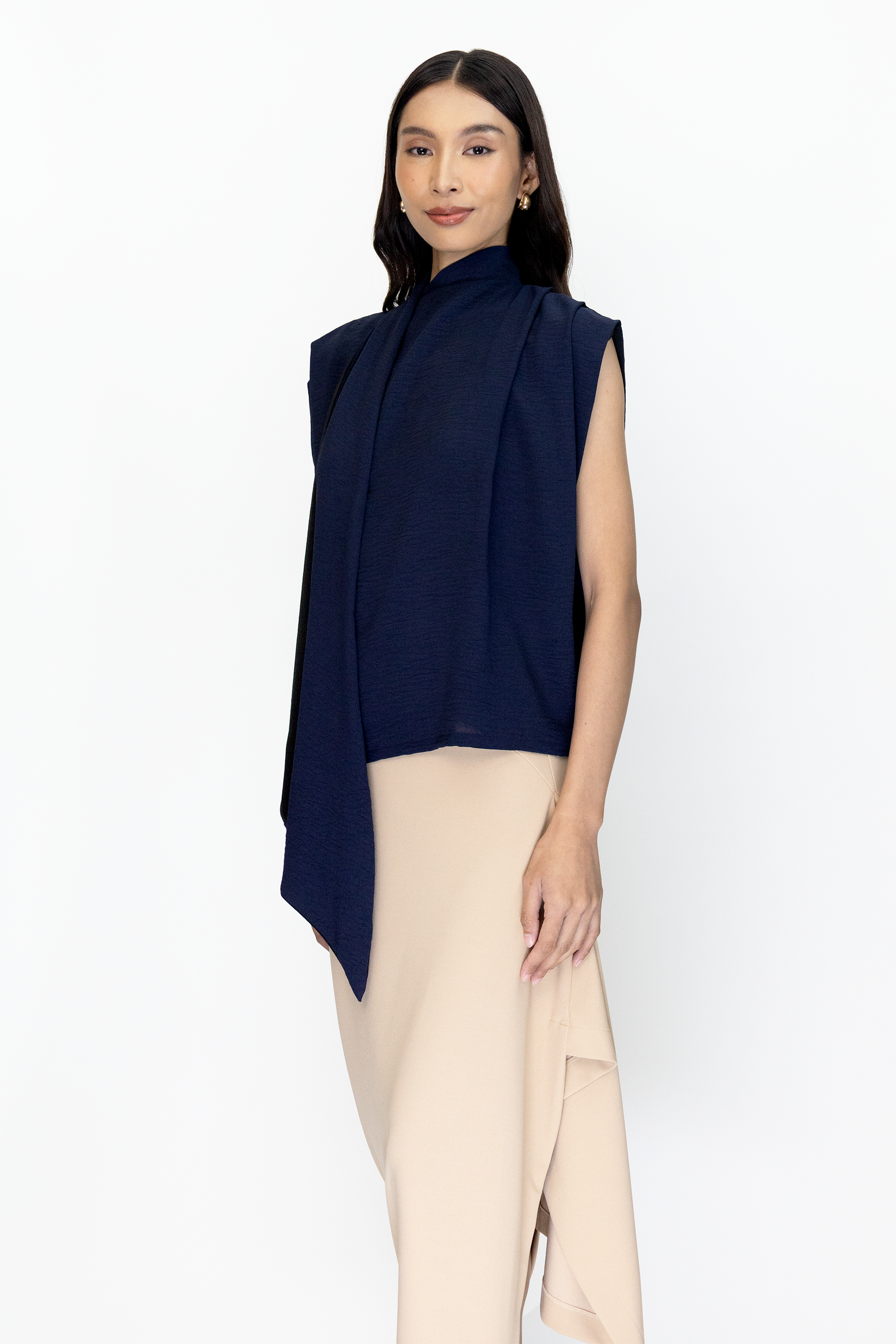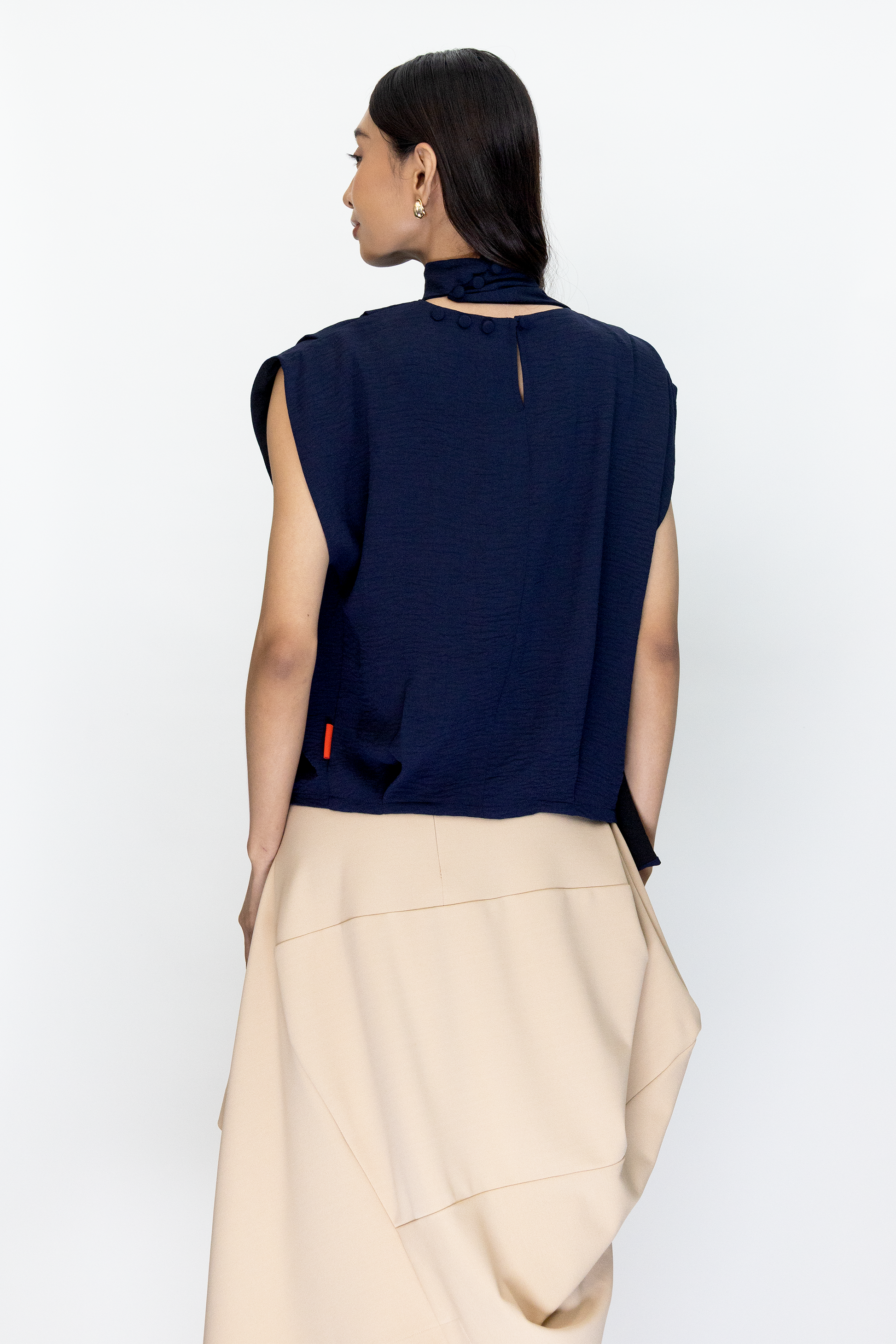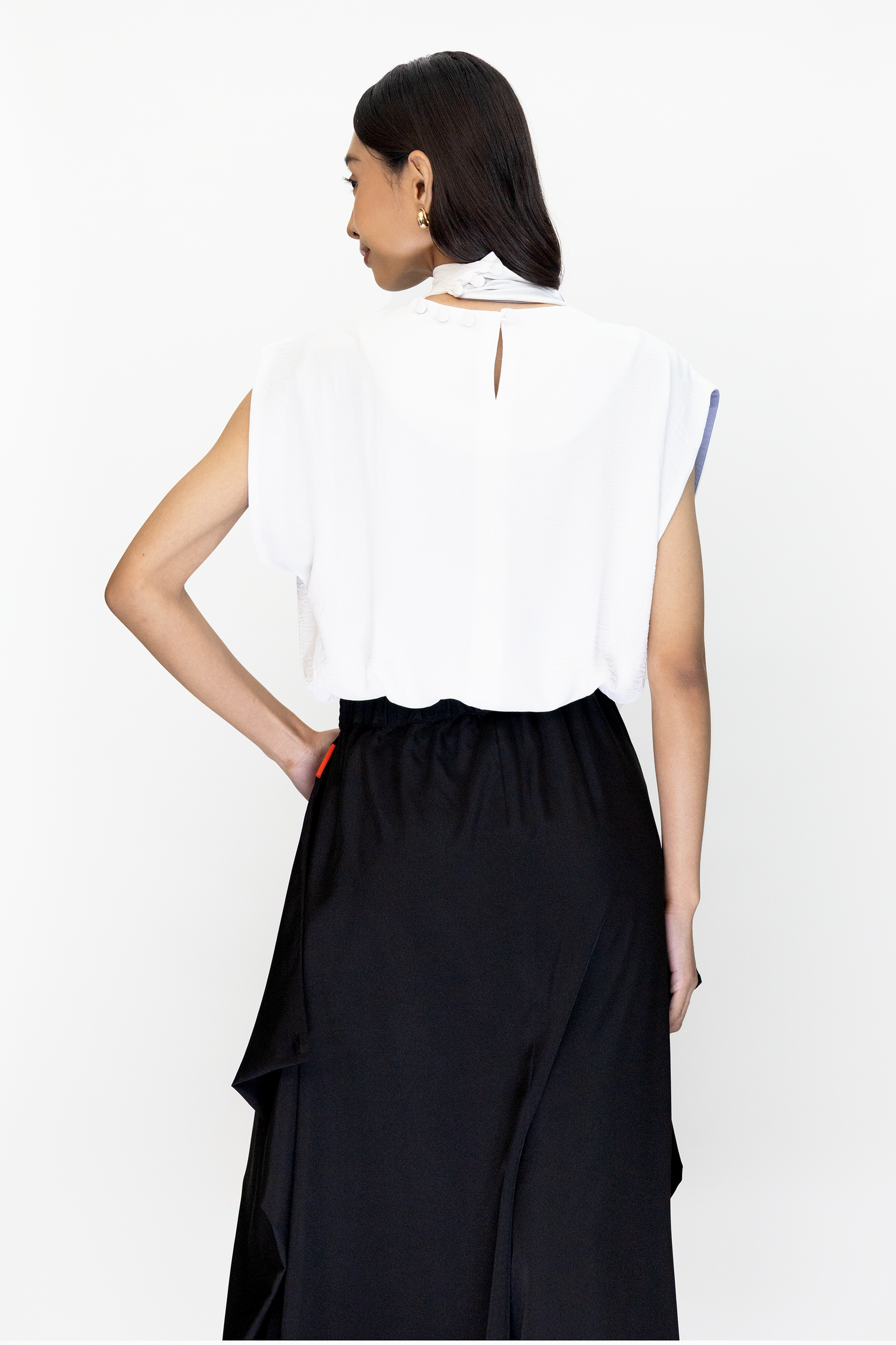 The Suma Top is a sleeveless top with two tone colored neck sash.