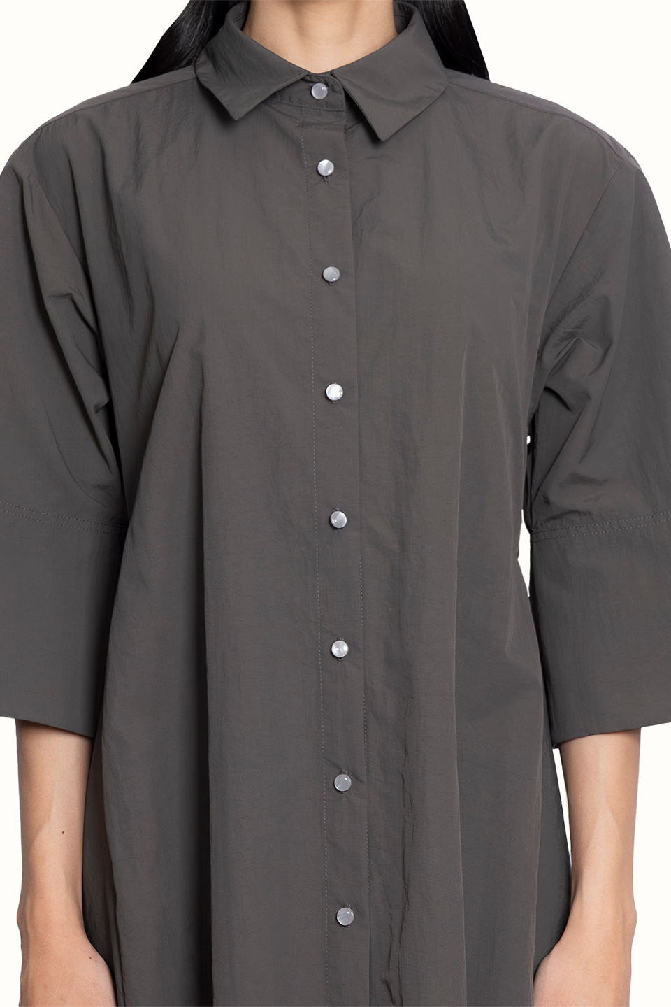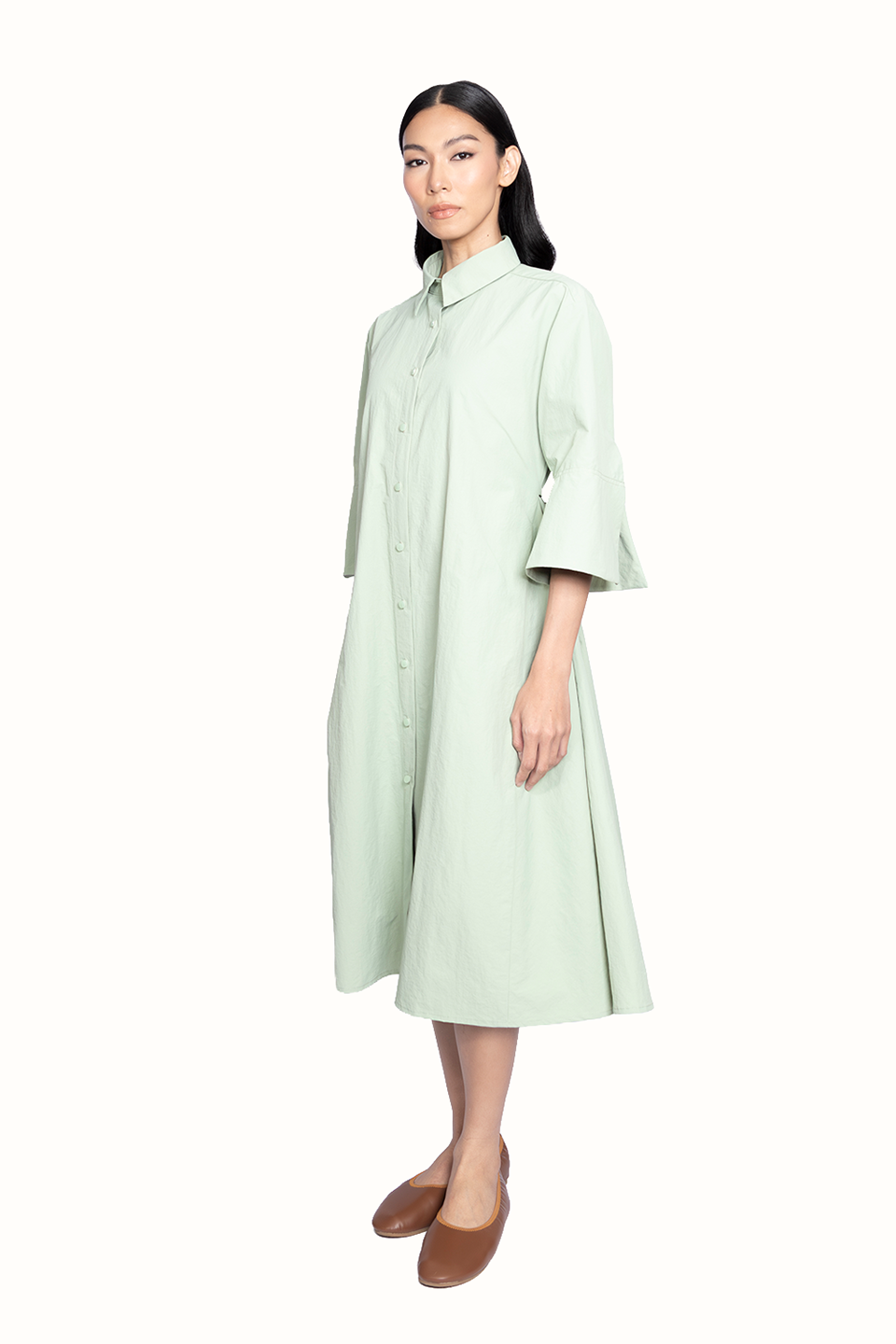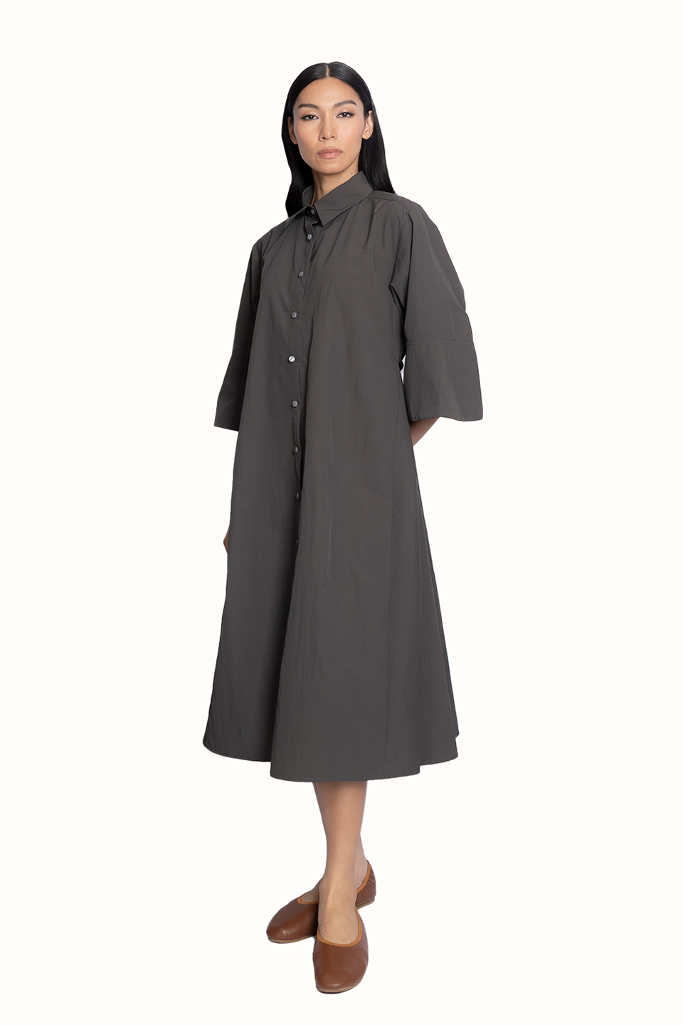 The True Dress is a shirt-style dress with side godets and a tie.